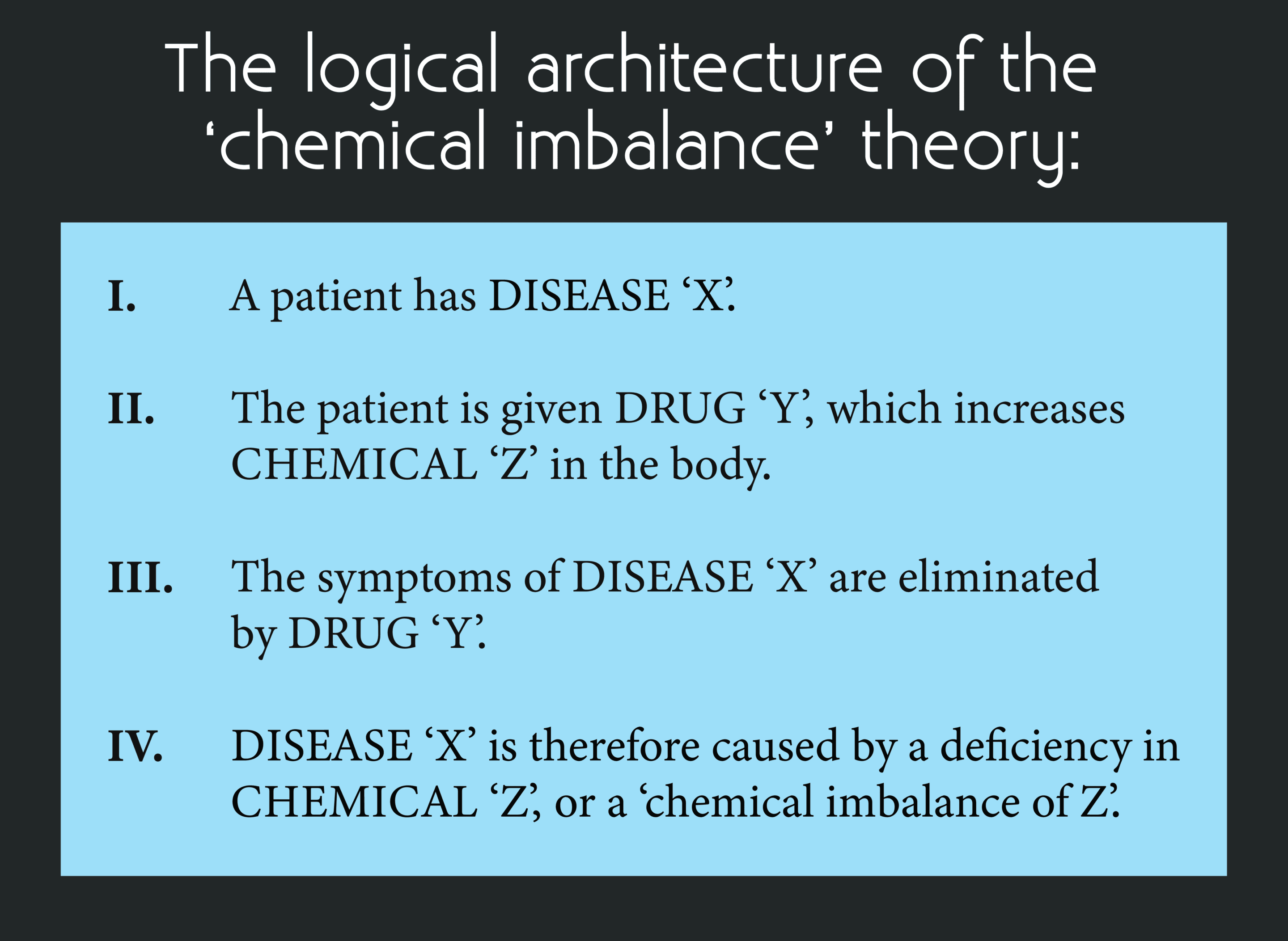 Let’s take a deeper look at the logical nuts and bolts underneath the ‘chemical imbalance’ explanation. If we break it down to its basic logical architecture, we could express the idea like this:
