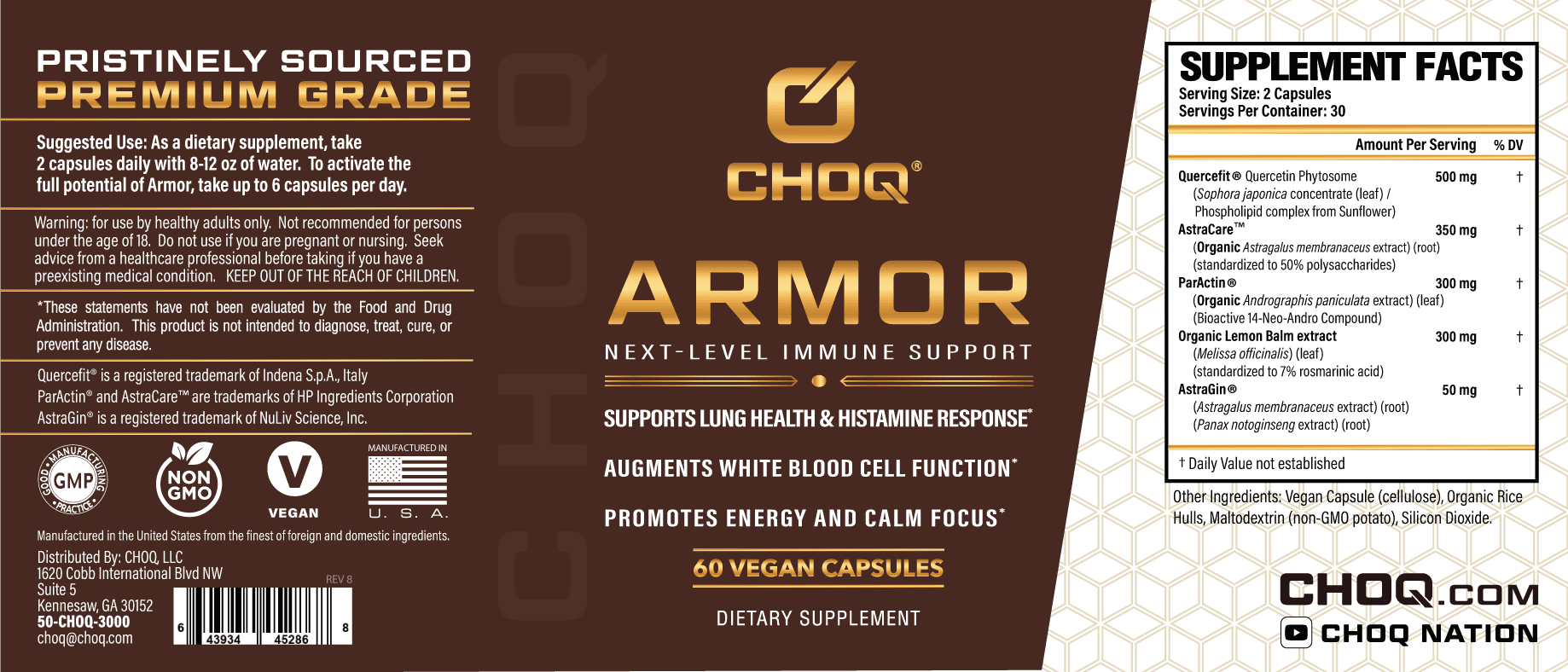 This is SERIOUS immune support. A world-class immuno-adaptogen with a plethora of side benefits, including powerful support for healthy histamine levels, CHOQ Armor features a unique 20x absorption Quercetin Phytosome, Organic Astragalus, and Organic Andrographis paniculata.