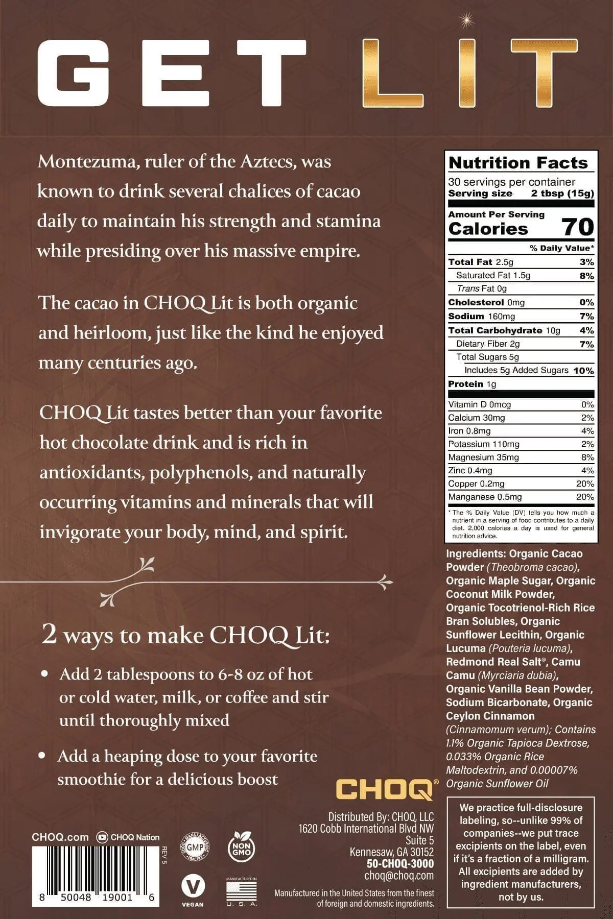 Start your morning by getting LIT: the most delicious way to wash down your daily STAQ. CHOQ Lit Powder is a multi-purpose, chef-formulated blend of premium cacao and superfoods that mixes easily into a hot or cold beverage but can also be added to your smoothies to give them an extra boost.